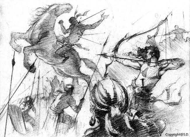 ಒಮ್ಮೆ ಭೂರಿಶ್ರವ ಮತ್ತು ಸಾತ್ಯಕಿ ಯುದ್ಧದಲ್ಲಿ ನಿರತರಾಗಿದ್ದಾಗ ತನ್ನ ಮಕ್ಕಳ ಸಾವಿನಿಂದ ವಿಚಲಿತನಾಗುವ ಯುಯುಧು ಇದರಿಂದ ಆತನ ಕೈಯಿಂದ ಕತ್ತಿ ಜಾರಿ ಕೆಳಗಡೆ ಬೀಳುತ್ತೆ ಇದನ್ನೇ ಕಾದು ನಿಂತಿದ್ದ ಭೂರಿಶ್ರವ ಇನ್ನೇನು ಕತ್ತಿ ಬೀಸಿ ಯುಯುಧುವಿನ ತಲೆ ಕತ್ತರಿಸಿ ಹಾಕ್ಬೇಕು ಅಷ್ಟರಲ್ಲಿ ಬಂದ ಅರ್ಜುನನ ಬಾಣ ಭೂರಿಶ್ರವನ ಕೈ ಎರಡನ್ನು ಕತ್ತರಿಸಿ ಹಾಕಿ ಬಿಡುತ್ತೆ. (ಇದು ಯುದ್ಧ ನೀತಿಗೆ ವಿರುದ್ಧ. ಇಬ್ಬರು ಯುದ್ಧ ಮಾಡುವ ಸಮಯದಲ್ಲಿ ಮೂರನೇ ವ್ಯಕ್ತಿ ಅದರಲ್ಲಿ ಹಸ್ತಕ್ಷೇಪ ಮಾಡ್ಬಾರ್ದು. ಆದರೆ ಇಡೀ ನಾರಾಯಣ ಸೇನೆ ಕೌರವರ ಪರ ಇದ್ದಾಗಲೂ ತನ್ನ ಸೇನಾಪತಿ ಪಟ್ಟ ತ್ಯಾಗ ಮಾಡಿ ಈ ಯುಯುಧು ಪಾಂಡವರ ಪರ ನಿಂತ ಕಾರಣ “ಸಾತ್ಯಕಿ ನೀನು ನನ್ನ ಕಣ್ಣಳತೆಯಲ್ಲಿ ಯುದ್ಧ ಮಾಡೋ ಸಮಯದಲ್ಲಿ ನಿನ್ನ ಒಂದೇ ಒಂದು ಕೂದಲು ಕೊಂಕೊದಕ್ಕೂ ನಾನು ಬಿಡಲ್ಲ ” ಅನ್ನೋ ವಚನ ಕೊಟ್ಟಿರೋ ಕಾರಣ ಅರ್ಜುನ ಅಲ್ಲಿ ಮಧ್ಯ ಪ್ರವೇಶ ಮಾಡ್ತಾನೆ )