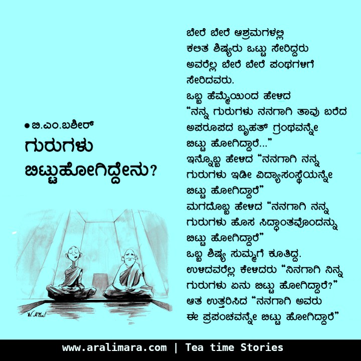 ಗುರುಗಳು ಬಿಟ್ಟುಹೋಗಿದ್ದೇನು? : Teatime Story ಏಪ್ರಿಲ್ 21, 2020 By ಅರಳಿ ಮರ ಬಿ.ಎಂ.ಬಶೀರ್ ಹೇಳಿದ ಝೆನ್ ಕಥೆ…. Share this:Tweet Click to email a link to a friend (Opens in new window) Email Click to share on Telegram (Opens in new window) Telegram Click to share on WhatsApp (Opens in new window) WhatsApp ಇನ್ನಷ್ಟು Click to print (Opens in new window) Print Click to share on Reddit (Opens in new window) Reddit Share on TumblrLike ಲೋಡ್ ಆಗುತ್ತಿದೆ... Related About ಅರಳಿ ಮರ ಆಧ್ಯಾತ್ಮ, ವ್ಯಕ್ತಿತ್ವ ವಿಕಸನ ಮತ್ತು ಜೀವನ ಶೈಲಿ