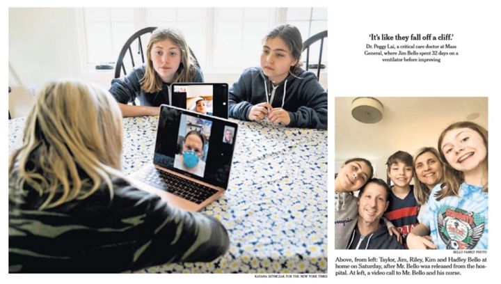 ಮಾರ್ಕೆಟಿಂಗ್ ಉದ್ಯೋಗದಲ್ಲಿದ್ದ ಬೆಲ್ಲೊ ಅವರ ಪತ್ನಿಗೆ (48) ವಿಷಯ ತಿಳಿಸಲಾಯಿತು. ಆಕೆ ರಜೆ ಪಡೆದು ತನ್ನ ಮೂರು ಮಕ್ಕಳು ಹ್ಯಾಡ್ಲಿ (13) ಮತ್ತು ಅವಳಿ ಜವಳಿಗಳಾದ ರೈಲಿ ಹಾಗೂ ಟೇಲರ್ (11) ಅವರನ್ನು ನೋಡಿಕೊಂಡು ಮನೆಯಲ್ಲಿದ್ದರು. ಬೆಲ್ಲೊ ಅವರು ಸಮಾಜ ಸೇವಕಿಯೂ ಆಗಿದ್ದು ತೀವ್ರ ನಿಗಾದಲ್ಲಿ ಆಹಾರ ಮತ್ತಿತರ ಸೌಕರ್ಯಗಳನ್ನು ಒದಗಿಸಲು ದೇಣಿಗೆ ಸಂಗ್ರಹಿಸಿದ್ದರು. ಆಕೆಗೆ ಮತ್ತು ಹ್ಯಾಡ್ಲಿಗೆ ಲಘು ಶೀತ ಎದೆ ಬಿಗಿತದ ಲಕ್ಷಣಗಳಿದ್ದವು ಆದರೆ ಅವರಿಗೆ ಕೊರೊನಾ ತಪಾಸಣೆ ಬೇಡ ಎಂದು ವೈದ್ಯರು ತೀರ್ಮಾನಿಸಿದರು. ತೀವ್ರ ನಿಗಾ ವಿಭಾಗಕ್ಕೆ ಭೇಟಿ ನಿಷಿದ್ಧವಾದ್ದರಿಂದ ದಾದಿ ಕೆರ್ರಿ ವೊಕೆಲ್ ಅವರು ಬೆಲ್ಲೊ ಅವರನ್ನು ಫೋನ್ ಮೂಲಕ ಸಂಪರ್ಕ ಸಂಪರ್ಕಿಸುತ್ತಿದ್ದರು. ಹ್ಯಾಡ್ಲಿ “ನಾನು ಕೇಕ್ ಮಾಡಿದೆ. ಸರಿಯಾಗಿಲ್ಲ ಇನ್ನೊಮ್ಮೆ ಪ್ರಯತ್ನ ಮಾಡ್ತೇನೆ” ಎಂದು ಅಪ್ಪನಿಗೆ ಹೇಳಿದರೆ, ಟೇಲರ್ “ನಾನು ಹಿತ್ತಲಲ್ಲಿ ಫುಟ್ ಬಾಲ್ ಪ್ರಾಕ್ಟೀಸ್ ಮಾಡ್ತಿದ್ದೇನೆ” ಎನ್ನುತ್ತಿದ್ದ. ದಾರುಣ ಸ್ಥಿತಿಯಲ್ಲಿದ್ದ ಅಪ್ಪನ ಜೊತೆ ಮುಗ್ಧ ಮಕ್ಕಳ ಈ ಮಾತುಗಳು ದುಃಖ ತರಿಸುತ್ತಿದ್ದವು ಎಂದು ನೆನಪಿಸಿಕೊಳ್ಳುತ್ತಾರೆ ದಾದಿ ಕೆರ್ರಿ.