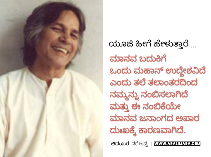 ಯುಜಿ : ಬದುಕಿನ ಅರ್ಥದ ಬಗ್ಗೆ ನಾನು ಹೇಳುವುದು ಮುಖ್ಯವಲ್ಲ, ನೀವು ಏನು ಹೇಳುತ್ತೀರಿ? ಹಿಂದಿನ ಚಿಂತಕರ ಮಾತು ನಿಜವೋ ಸುಳ್ಳೋ ಯಾರಿಗೆ ಏನು ಉಪಯೋಗ? ಈ ಬಗ್ಗೆ ತಿಳಿದುಕೊಳ್ಳಲು ನೀವೆನಾದರೂ ಸ್ವಂತ ಪ್ರಯತ್ನ ಮಾಡಿದ್ದೀರಾ? ನನ್ನ ಪ್ರಕಾರ ಅಂಥ ಯಾವ ಘನ ಉದ್ದೇಶವೂ ಮನುಷ್ಯ ಬದುಕಿಗೆ ಇಲ್ಲ, ಅಕಸ್ಮಾತ್ ಇದ್ದರೂ ಅದನ್ನು ತಿಳಿದುಕೊಳ್ಳುವ ಯಾವ ಸಾಧನವೂ ಇಲ್ಲ.