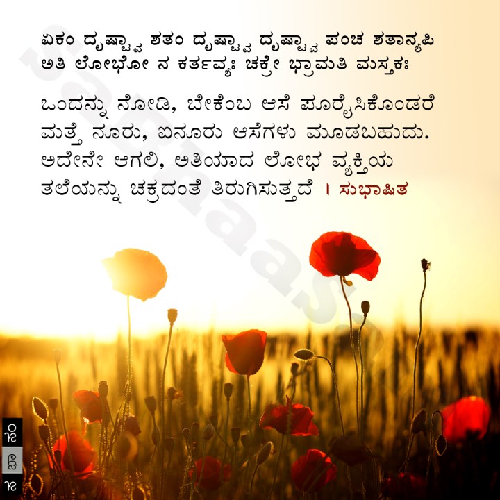 ಏಕಂ ದೃಷ್ಟ್ವಾ ಶತಂ ದೃಷ್ಟ್ವಾ ದೃಷ್ಟ್ವಾ ಪಂಚ ಶತಾದ್ಯಪಿ| ಅತಿ ಲೋಭೋ ನ ಕರ್ತವ್ಯಃ ಚಕ್ರೇ ಭ್ರಾಮತಿ ಮಸ್ತಕಃ : “ಒಂದನ್ನು ನೋಡಿ ಅದು ಬೇಕೆಂದು ಬಯಸಿ, ಪಡೆದು ಆಸೆ ಪೂರೈಸಿಕೊಂಡರೆ ನೂರು ಆಸೆಗಳು ಹುಟ್ಟಿಕೊಳ್ತವೆ. ಅವನ್ನೂ ಪೂರೈಸಿದೆವು ಅಂತಿಟ್ಟುಕೊಳ್ಳಿ, ಐನೂರು ಆಸೆಗಳು ಹುಟ್ಟಿ ತಲೆ ತಿರುಗಿಸುತ್ತವೆ. ಆದ್ದರಿಂದ ಬಯಸಿ, ಬಯಸಿದ್ದನ್ನು ಪಡೆಯಬೇಕೆನ್ನುವ ಲೋಭ ಒಂದರ ಕುರಿತಾದರೂ ಅಷ್ಟೇ, ನೂರರ ಕುರಿತಾದರೂ ಅಷ್ಟೇ, ಪರಿಣಾಮದಲ್ಲಿ ವ್ಯತ್ಯಾಸವೇನಿಲ್ಲ” – ಇದು ಈ ಸುಭಾಷಿತದ ಅರ್ಥ.