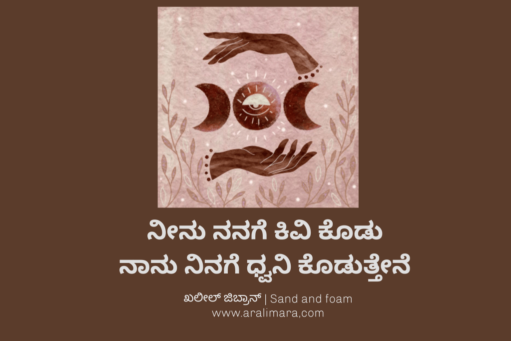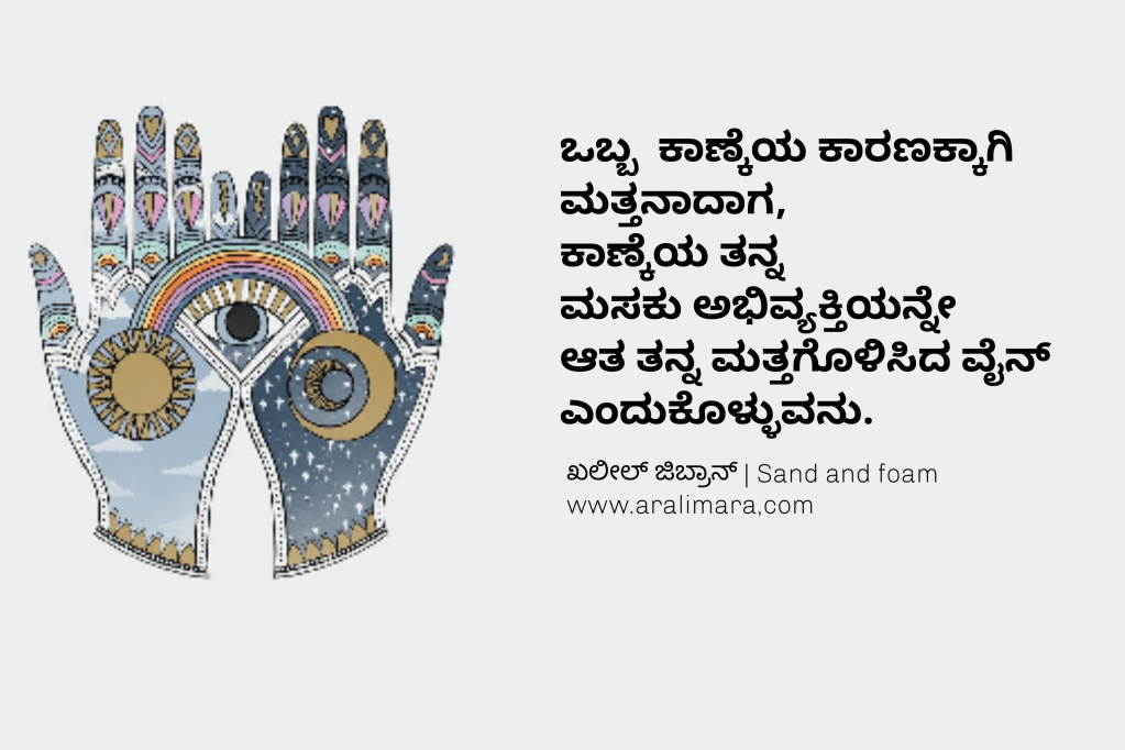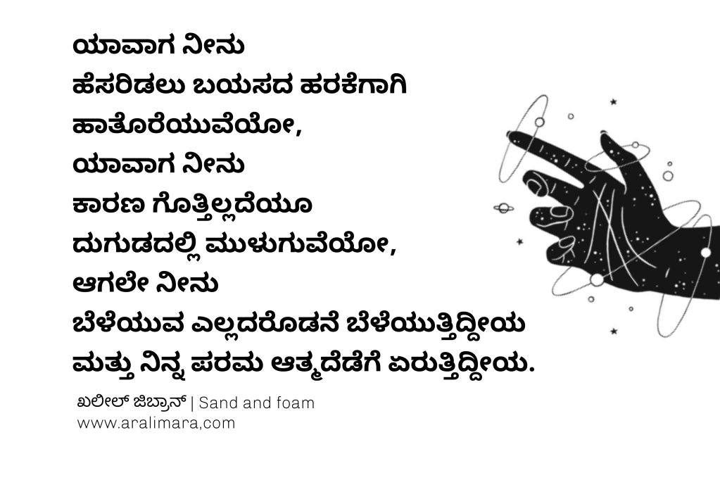 sand and foam – ಮರಳು ಮತ್ತು ನೊರೆ ಖಲೀಲ್ ಜಿಬ್ರಾನ್’ರ ಇತರ ಕೃತಿಗಳಂತೆಯೇ ತತ್ವ ದರ್ಶನ ಮಾಡಿಸುವ ಸುಂದರ ಕೃತಿ. ಕಾವ್ಯಶೈಲಿಯ ಈ ಕೃತಿಯ ಬರಹಗಳು ಬೊಗಸೆಯಲ್ಲೆ ಜಗತ್ತನ್ನು ತೋರುವ ವೈಶಿಷ್ಟ್ಯದಿಂದ ಗಮನ ಸೆಳೆಯುತ್ತವೆ. ಅರಳಿಬಳಗ ಚಿದಂಬರ ನರೇಂದ್ರ ಇವನ್ನು ಕನ್ನಡಕ್ಕೆ ತಂದಿದ್ದಾರೆ.