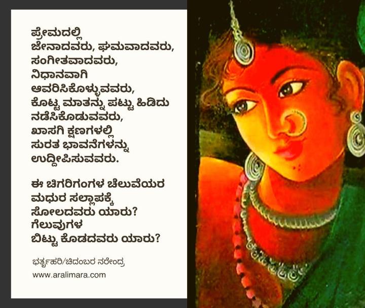 ಸೋಲದವರು ಯಾರು? : ಭರ್ತೃಹರಿಯ ಶೃಂಗಾರ ಶತಕದಿಂದ ಜುಲೈ 19, 2020 By ಅರಳಿ ಮರ ಭರ್ತೃಹರಿ | ಚಿದಂಬರ ನರೇಂದ್ರ Share this:Tweet Click to email a link to a friend (Opens in new window) Email Click to share on Telegram (Opens in new window) Telegram Click to share on WhatsApp (Opens in new window) WhatsApp ಇನ್ನಷ್ಟು Click to print (Opens in new window) Print Click to share on Reddit (Opens in new window) Reddit Share on TumblrLike ಲೋಡ್ ಆಗುತ್ತಿದೆ... Related About ಅರಳಿ ಮರ ಆಧ್ಯಾತ್ಮ, ವ್ಯಕ್ತಿತ್ವ ವಿಕಸನ ಮತ್ತು ಜೀವನ ಶೈಲಿ