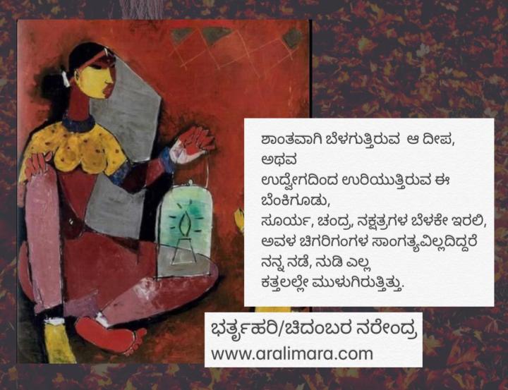 ಕತ್ತಲಲ್ಲೇ ಮುಳುಗಿರುತ್ತಿತ್ತು… : ಶೃಂಗಾರ ಶತಕದಿಂದ ಆಗಷ್ಟ್ 24, 2020 By ಅರಳಿ ಮರ ಆಕರ : ಭರ್ತೃಹರಿಯ ಶೃಂಗಾರ ಶತಕ | ಕನ್ನಡ ಮರು ರೂಪ : ಚಿದಂಬರ ನರೇಂದ್ರ Share this:Tweet Click to email a link to a friend (Opens in new window) Email Click to share on Telegram (Opens in new window) Telegram Click to share on WhatsApp (Opens in new window) WhatsApp ಇನ್ನಷ್ಟು Click to print (Opens in new window) Print Click to share on Reddit (Opens in new window) Reddit Share on TumblrLike ಲೋಡ್ ಆಗುತ್ತಿದೆ... Related About ಅರಳಿ ಮರ ಆಧ್ಯಾತ್ಮ, ವ್ಯಕ್ತಿತ್ವ ವಿಕಸನ ಮತ್ತು ಜೀವನ ಶೈಲಿ