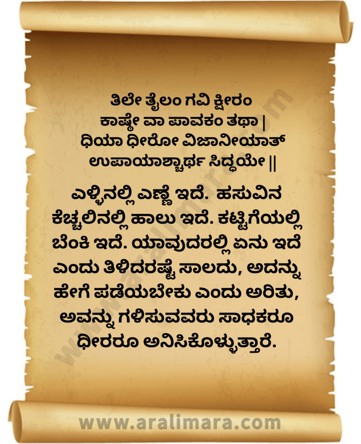 ತಾತ್ಪರ್ಯ: ಎಳ್ಳಿನಲ್ಲಿ ಎಣ್ಣೆ ಇದೆ. ಅದನ್ನು ಪಡೆಯಲು ಗಾಣ, ಅಥವಾ ಯಂತ್ರದ ಉಪಯೋಗ ನಮಗೆ ತಿಳಿದಿರಬೇಕು. ಹಸುವಿನ ಕೆಚ್ಚಲಿನಲ್ಲಿ ಹಾಲು ಇದೆ. ಹಾಲು ಪಡೆಯಲು ನಮಗೆ ಕೆಚ್ಚಲಿನಿಂದ ಹಾಲು ಕರೆಯುವ ಕಲೆ ಗೊತ್ತಿರಬೇಕು. ಕಟ್ಟಿಗೆಯಲ್ಲಿ ಬೆಂಕಿ ಇದೆ. ಬೆಂಕಿಯನ್ನು ಪಡೆಯಲು ನಾವು ಮಥಿಸಬೇಕು. ಯಾವುದರಲ್ಲಿ ಏನು ಇದೆ ಎಂದು ತಿಳಿದರಷ್ಟೆ ಸಾಲದು, ಅದನ್ನು ಹೇಗೆ ಪಡೆಯಬೇಕು ಎಂದು ಅರಿತು, ಅವನ್ನು ಗಳಿಸುವವರು ಸಾಧಕರೂ ಧೀರರೂ ಅನಿಸಿಕೊಳ್ಳುತ್ತಾರೆ.