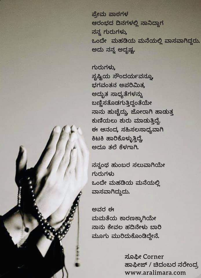 ಮಹಡಿಯಲ್ಲಿ ಗುರು : ಸೂಫಿ corner ಸೆಪ್ಟೆಂಬರ್ 5, 2020 By ಅರಳಿ ಮರ ಗುರುವಿನ ಮಮತೆ ಬಗ್ಗೆ ಹದಿನೇಳು ಸಲ ಮೂಗು ಮುರಿದುಕೊಂಡ ಹಫೀಜ್ ಹೇಳೋದು ಕೇಳಿ! ಮೂಲ : ಹಫೀಜ್ | ಕನ್ನಡದಲ್ಲಿ : ಚಿದಂಬರ ನರೇಂದ್ರ Share this:Tweet Click to email a link to a friend (Opens in new window) Email Click to share on Telegram (Opens in new window) Telegram Click to share on WhatsApp (Opens in new window) WhatsApp ಇನ್ನಷ್ಟು Click to print (Opens in new window) Print Click to share on Reddit (Opens in new window) Reddit Share on TumblrLike ಲೋಡ್ ಆಗುತ್ತಿದೆ... Related About ಅರಳಿ ಮರ ಆಧ್ಯಾತ್ಮ, ವ್ಯಕ್ತಿತ್ವ ವಿಕಸನ ಮತ್ತು ಜೀವನ ಶೈಲಿ