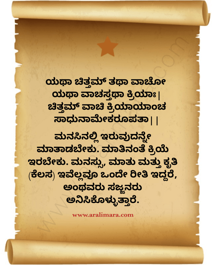 ಯಥಾ ಚಿತ್ತಮ್ ತಥಾ ವಾಚೋ ಯಥಾ ವಾಚಸ್ತಥಾ ಕ್ರಿಯಾಃ|