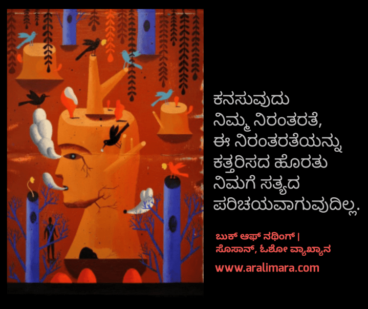 ನಿಮ್ಮ ಕಣ್ಣುಗಳು ಸ್ಪಷ್ಟವಾಗಿ, ಯಾವ ಅಡತಡೆ ಇಲ್ಲದೆ ನೋಡುತ್ತಿರುವಾಗ, ನಿಮ್ಮ ಬುದ್ಧಿ – ಮನಸ್ಸು ಕನಸಿನಿಂದ ಹೊರತಾಗಿರುವಾಗ, ಸಾಧ್ಯವಾಗೋದು ಒಂದೇ ಅದೇ ಸತ್ಯ. ಆದರೆ ನೀವು ಕನಸಿನಲ್ಲಿ ಮುಳುಗಿರುವಾಗ ಬಾಕಿ ಎರಡು ವರ್ಗೀಕರಣಗಳೂ ಅಸ್ತಿತ್ವದಲ್ಲಿ ಬರುತ್ತವೆ ~ ಸೊಸಾನ್ | ಓಶೋ ವ್ಯಾಖ್ಯಾನ; ಭಾವಾನುವಾದ : ಚಿದಂಬರ ನರೇಂದ್ರ