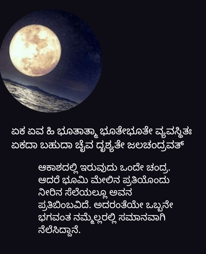 ಏಕ ಏವ ಹಿ ಭೂತಾತ್ಮಾ ಭೂತೇಭೂತೇ ವ್ಯವಸ್ಥಿತಃ| ಏಕಧಾ ಬಹುಧಾ ಚೈವ ದೃಶ್ಯತೇ ಜಲಚಂದ್ರವತ್