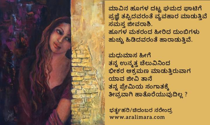 ಮಧು ಮಾಸ ಹೀಗೆ… | ಶೃಂಗಾರ ಶತಕದಿಂದ ನವೆಂಬರ್ 2, 2020 By ಅರಳಿ ಮರ ಆಕರ: ಭರ್ತೃಹರಿಯ ಶೃಂಗಾರ ಶತಕ | ರಚನೆ: ಚಿದಂಬರ ನರೇಂದ್ರ Share this:Tweet Click to email a link to a friend (Opens in new window) Email Click to share on Telegram (Opens in new window) Telegram Click to share on WhatsApp (Opens in new window) WhatsApp ಇನ್ನಷ್ಟು Click to print (Opens in new window) Print Click to share on Reddit (Opens in new window) Reddit Share on TumblrLike ಲೋಡ್ ಆಗುತ್ತಿದೆ... Related About ಅರಳಿ ಮರ ಆಧ್ಯಾತ್ಮ, ವ್ಯಕ್ತಿತ್ವ ವಿಕಸನ ಮತ್ತು ಜೀವನ ಶೈಲಿ