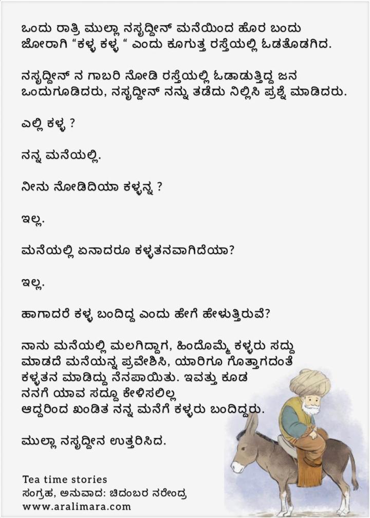 ನಸ್ರುದ್ದೀನ್ ಮನೆಗೆ ಕಳ್ಳ ಬಂದಿದ್ದು… | Tea time story ನವೆಂಬರ್ 10, 2020 By ಅರಳಿ ಮರ ನಸ್ರುದ್ದೀನನಿಗೆ ತನ್ನ ಮನೆಗೆ ಕಳ್ಳ ಬಂದಿದ್ದಾನೆ ಅನಿಸಿದ್ದು ಯಾಕೆ!? | ಸಂಗ್ರಹ ಮತ್ತು ಅನುವಾದ : ಚಿದಂಬರ ನರೇಂದ್ರ Share this:Tweet Click to email a link to a friend (Opens in new window) Email Click to share on Telegram (Opens in new window) Telegram Click to share on WhatsApp (Opens in new window) WhatsApp ಇನ್ನಷ್ಟು Click to print (Opens in new window) Print Click to share on Reddit (Opens in new window) Reddit Share on TumblrLike ಲೋಡ್ ಆಗುತ್ತಿದೆ... Related About ಅರಳಿ ಮರ ಆಧ್ಯಾತ್ಮ, ವ್ಯಕ್ತಿತ್ವ ವಿಕಸನ ಮತ್ತು ಜೀವನ ಶೈಲಿ