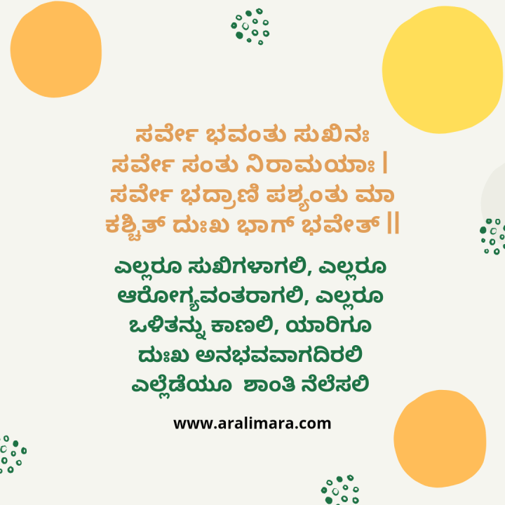 “ಎಲ್ಲರೂ ಸುಖಿಗಳಾಗಲಿ, ಎಲ್ಲರೂ ಆರೋಗ್ಯವಂತರಾಗಲಿ, ಎಲ್ಲರೂ ಒಳಿತನ್ನು ಕಾಣಲಿ, ಯಾರಿಗೂ ದುಃಖ ಅನಭವವಾಗದಿರಲಿ ಎಲ್ಲೆಡೆಯೂ ಶಾಂತಿ ನೆಲೆಸಲಿ” ಎಂದು ವೇದೋಕ್ತಿಯು ಹಾರೈಸುತ್ತದೆ…