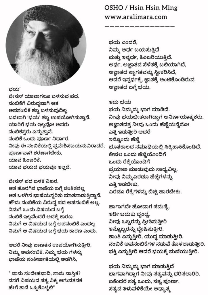 ಭಯ ಇಲ್ಲದವರೇ ನಂಬಿಕಸ್ಥರು! ಡಿಸೆಂಬರ್ 11, 2020 By ಅರಳಿ ಮರ Hsin hsin Ming / ಓಶೋ ರಜನೀಶ್/ಕನ್ನಡಕ್ಕೆ : ಚಿದಂಬರ ನರೇಂದ್ರ Share this:Tweet Click to email a link to a friend (Opens in new window) Email Click to share on Telegram (Opens in new window) Telegram Click to share on WhatsApp (Opens in new window) WhatsApp ಇನ್ನಷ್ಟು Click to print (Opens in new window) Print Click to share on Reddit (Opens in new window) Reddit Share on TumblrLike ಲೋಡ್ ಆಗುತ್ತಿದೆ... Related About ಅರಳಿ ಮರ ಆಧ್ಯಾತ್ಮ, ವ್ಯಕ್ತಿತ್ವ ವಿಕಸನ ಮತ್ತು ಜೀವನ ಶೈಲಿ