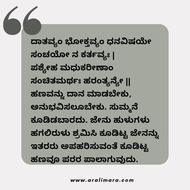 “ಹಣವನ್ನು ದಾನ ಮಾಡಬೇಕು, ಅನುಭವಿಸಲೂಬೇಕು. ಸುಮ್ಮನೆ ಕೂಡಿಡಬಾರದು. ಜೇನು ಹುಳುಗಳು ಹಗಲಿರುಳು ಶ್ರಮಿಸಿ ಕೂಡಿಟ್ಟ ಜೇನನ್ನು ಇತರರು ಅಪಹರಿಸುತ್ತಾರೆ ನೋಡಿ, ಹಾಗೇ ಇದೂ ಪಲರ ಪಾಲಾಗುವುದು!” ಅನ್ನುತ್ತದೆ ಪಂಚತಂತ್ರ.