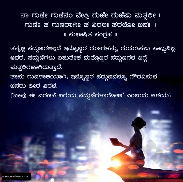 ಪರರ ಸದ್ಗುಣಗಳನ್ನು ಗೌರವಿಸುವುದು ಕೂಡಾ ಸ್ವತಃ ನಾವು ಸದ್ಗುಣಿಗಳಾಗಲು ಇರುವ ಮಾರ್ಗ. ಆದ್ದರಿಂದ, ಮತ್ಸರ ಬೇಡ, ಪರರ ಗುಣವಿಶೇಷಗಳನ್ನು ಆದರಿಸೋಣ ಅನ್ನುತ್ತದೆ ಈ ಸುಭಾಷಿತ.