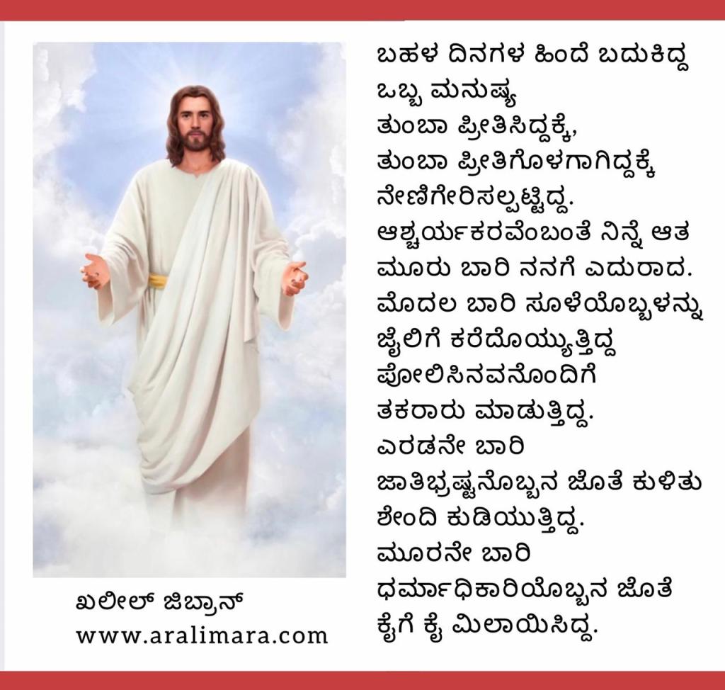 ಏಸು : ಎರಡು ಜಿಬ್ರಾನ್ ಪದ್ಯಗಳು ಡಿಸೆಂಬರ್ 25, 2020 By ಅರಳಿ ಮರ ಮೂಲ : ಖಲೀಲ್ ಜಿಬ್ರಾನ್ | ಕನ್ನಡಕ್ಕೆ : ಚಿದಂಬರ ನರೇಂದ್ರ Share this:Tweet Click to email a link to a friend (Opens in new window) Email Click to share on Telegram (Opens in new window) Telegram Click to share on WhatsApp (Opens in new window) WhatsApp ಇನ್ನಷ್ಟು Click to print (Opens in new window) Print Click to share on Reddit (Opens in new window) Reddit Share on TumblrLike ಲೋಡ್ ಆಗುತ್ತಿದೆ... Related About ಅರಳಿ ಮರ ಆಧ್ಯಾತ್ಮ, ವ್ಯಕ್ತಿತ್ವ ವಿಕಸನ ಮತ್ತು ಜೀವನ ಶೈಲಿ