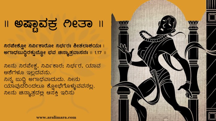 […] ಜನಕ ಮಹಾರಾಜ ಅಷ್ಟಾವಕ್ರ ಮುನಿಯ ಬಳಿ “ಜ್ಞಾನ ಪಡೆಯುವುದು ಹೇಗೆ? ಮುಕ್ತಿ ಪಡೆಯುವುದು ಹೇಗೆ?” ಎಂದು ಪ್ರಶ್ನಿಸುತ್ತಾನೆ. ಈ ಪ್ರಶ್ನೆಗೆ ಅಷ್ಟಾವಕ್ರ ಉತ್ತರ ನೀಡಲಾರಂಭಿಸುತ್ತಾನೆ. ಈ ಸಂವಾದದ ಮುಂದುವರಿದ ಭಾಗ ಇದು. ಈ ಸಂಚಿಕೆಯಲ್ಲಿ 18ನೇ ಶ್ಲೋಕದ ವಿವರಣೆಯಿದೆ ~ ಸಾ.ಹಿರಣ್ಮಯಿ ಹಿಂದಿನ ಭಾಗಗಳನ್ನು ಇಲ್ಲಿ ನೋಡಿ : https://aralimara.com/2019/02/25/ashta-14/ […]