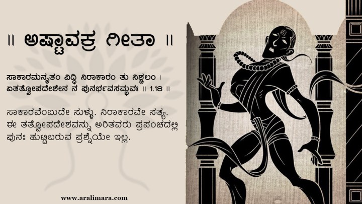 1. […] ಜನಕ ಮಹಾರಾಜ ಅಷ್ಟಾವಕ್ರ ಮುನಿಯ ಬಳಿ “ಜ್ಞಾನ ಪಡೆಯುವುದು ಹೇಗೆ? ಮುಕ್ತಿ ಪಡೆಯುವುದು ಹೇಗೆ?” ಎಂದು ಪ್ರಶ್ನಿಸುತ್ತಾನೆ. ಈ ಪ್ರಶ್ನೆಗೆ ಅಷ್ಟಾವಕ್ರ ಉತ್ತರ ನೀಡಲಾರಂಭಿಸುತ್ತಾನೆ. ಈ ಸಂವಾದದ ಮುಂದುವರಿದ ಭಾಗ ಇದು. ಈ ಸಂಚಿಕೆಯಲ್ಲಿ 19 ಮತ್ತು 20ನೇ ಶ್ಲೋಕಗಳ ವಿವರಣೆಯಿದೆ ~ ಸಾ.ಹಿರಣ್ಮಯಿ ಹಿಂದಿನ ಭಾಗಗಳನ್ನು ಇಲ್ಲಿ ನೋಡಿ : https://aralimara.com/2019/02/26/ashta-15/ […]