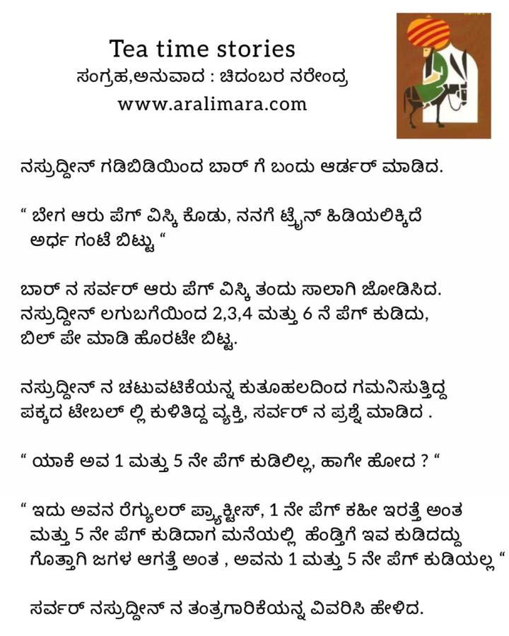 ನಸ್ರುದ್ದೀನನ ತಂತ್ರಗಾರಿಕೆ : tea time stories ಫೆಬ್ರವರಿ 9, 2021 By ಅರಳಿ ಮರ Share this:Tweet Click to email a link to a friend (Opens in new window) Email Click to share on Telegram (Opens in new window) Telegram Click to share on WhatsApp (Opens in new window) WhatsApp ಇನ್ನಷ್ಟು Click to print (Opens in new window) Print Click to share on Reddit (Opens in new window) Reddit Share on TumblrLike ಲೋಡ್ ಆಗುತ್ತಿದೆ... Related About ಅರಳಿ ಮರ ಆಧ್ಯಾತ್ಮ, ವ್ಯಕ್ತಿತ್ವ ವಿಕಸನ ಮತ್ತು ಜೀವನ ಶೈಲಿ