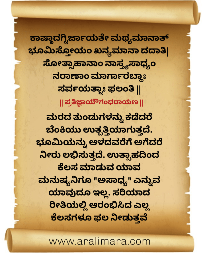 ಭೂಮಿಸ್ತೋಯಂ ಖನ್ಯಮಾನಾ ದದಾತಿ |ಸೋತ್ಸಾಹಾನಾಂ ನಾಸ್ತ್ಯಸಾಧ್ಯಂ ನರಾಣಾಂ ಮಾರ್ಗಾರಬ್ಧಾಃ ಸರ್ವಯತ್ನಾಃ ಫಲಂತಿ || (ಪ್ರತಿಜ್ಞಾಯೌಗಂಧರಾಯಣ)