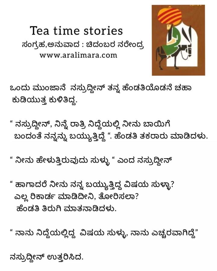 ನಸ್ರುದ್ದೀನನ ಧೈರ್ಯ : tea time story ಫೆಬ್ರವರಿ 12, 2021 By ಅರಳಿ ಮರ Share this:Tweet Click to email a link to a friend (Opens in new window) Email Click to share on Telegram (Opens in new window) Telegram Click to share on WhatsApp (Opens in new window) WhatsApp ಇನ್ನಷ್ಟು Click to print (Opens in new window) Print Click to share on Reddit (Opens in new window) Reddit Share on TumblrLike ಲೋಡ್ ಆಗುತ್ತಿದೆ... Related About ಅರಳಿ ಮರ ಆಧ್ಯಾತ್ಮ, ವ್ಯಕ್ತಿತ್ವ ವಿಕಸನ ಮತ್ತು ಜೀವನ ಶೈಲಿ