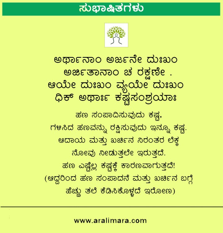 ಅರ್ಥಾನಾಂ ಅರ್ಜನೇ ದುಃಖಂ ಅರ್ಜಿತಾನಾಂ ಚ ರಕ್ಷಣೇ । ಆಯೇ ದುಃಖಂ ವ್ಯಯೇ ದುಃಖಂ ಧಿಕ್ ಅರ್ಥಾಃ ಕಷ್ಟಸಂಶ್ರಯಾಃ