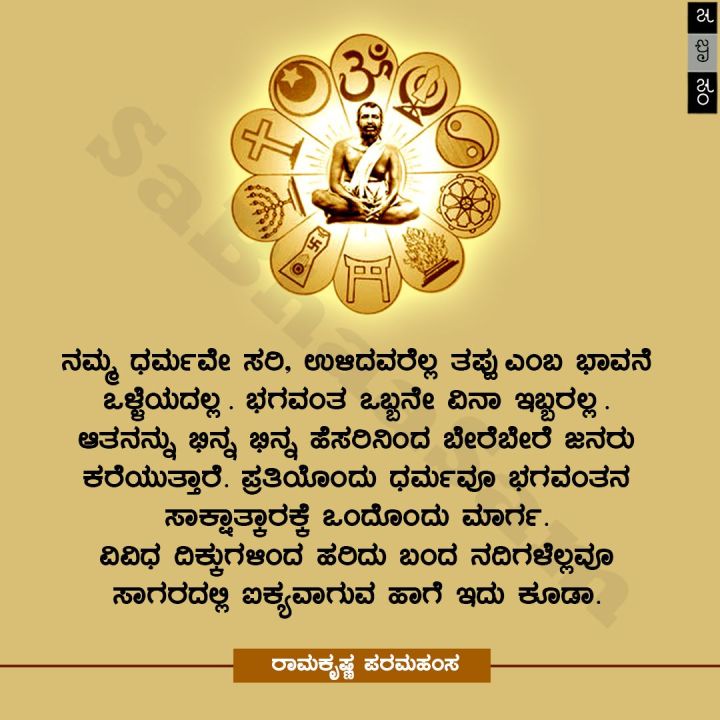 ಪರಮಹಂಸರು ಸಾರಿಸಾರಿ “ಎಲ್ಲಾ ಧರ್ಮವೂ ಸತ್ಯ ; ಎಷ್ಟು ಮತವೋ ಅಷ್ಟು ಪಥ ; ನಮ್ಮ ದೇವರು ಹೆಚ್ಚು ನಿಮ್ಮ ದೇವರು ಕಡಿಮೆ ಎಂದು ಕೀಳುಬುದ್ಧಿಯಿಂದ ಜಗಳವಾಡಬಾರದು ಯಾರು ಯಾವ ಮಾರ್ಗವನ್ನು ಅನುಸರಿಸಿದ್ದರೆ ಆ ಮಾರ್ಗವನ್ನೇ ಅನುಸರಿಸಲಿ, ಅವರ ಮಾರ್ಗವನ್ನು ಕೆಡಿಸಬೇಡಿ. ಹಿಂದೂ ಮತದಲ್ಲಿಯೂ ದ್ವೈತಾ ದ್ವೈತ ವಿಶಿಷ್ಟಾದ್ವೈತ ಮತಗಳು ಬೇರೆ ಬೇರೆಯಲ್ಲ. ಅವೆಲ್ಲವೂ ಒಬ್ಬೊಬ್ಬ ಸಾಧಕನ ಜೀವಮಾನದಲ್ಲಿಯೂ ಒಂದಾದ ಮೇಲೆ ಒ೦ದರಂತೆ ಬರತಕ್ಕ ಅವಸ್ಥಾಭೇಧಗಳು ” ಎಂದು ಮುಂತಾಗಿ ಹೇಳುತ್ತಿದ್ದರು. ಅವರ ಆಚರಣೆಯೂ “ಎಷ್ಟು ಮತವೋ ಅಷ್ಟು ಪಥ”ಎಂಬುದಕ್ಕೆ ತಕ್ಕಂತೆಯೇ ಇತ್ತು.
