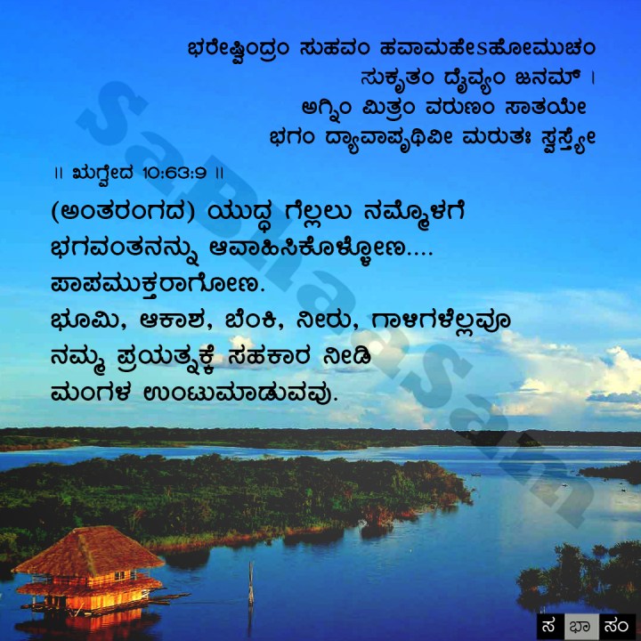 ಭರೇಷ್ವಿಂದ್ರಂ ಸುಹವಂ ಹವಾಮಹೇsಹೋಮುಚಂ ಸುಕೃತಂ ದೈವ್ಯಂ ಜನಮ್| ಅಗ್ನಿಂ ಮಿತ್ರಂ ವರುಣಂ ಸಾತಯೇ ಭಗಂ ದ್ಯಾವಾಪೃಥಿವೀ ಮರುತಃ ಸ್ವಸ್ತ್ಯೇ ||ಋಗ್ವೇದ | 10.63.9||