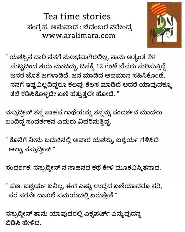 ನಸ್ರುದ್ದೀನನ ಸಾಧನೆ : tea time story ಮಾರ್ಚ್ 12, 2021 By ಅರಳಿ ಮರ Share this:Tweet Click to email a link to a friend (Opens in new window) Email Click to share on Telegram (Opens in new window) Telegram Click to share on WhatsApp (Opens in new window) WhatsApp ಇನ್ನಷ್ಟು Click to print (Opens in new window) Print Click to share on Reddit (Opens in new window) Reddit Share on TumblrLike ಲೋಡ್ ಆಗುತ್ತಿದೆ... Related About ಅರಳಿ ಮರ ಆಧ್ಯಾತ್ಮ, ವ್ಯಕ್ತಿತ್ವ ವಿಕಸನ ಮತ್ತು ಜೀವನ ಶೈಲಿ