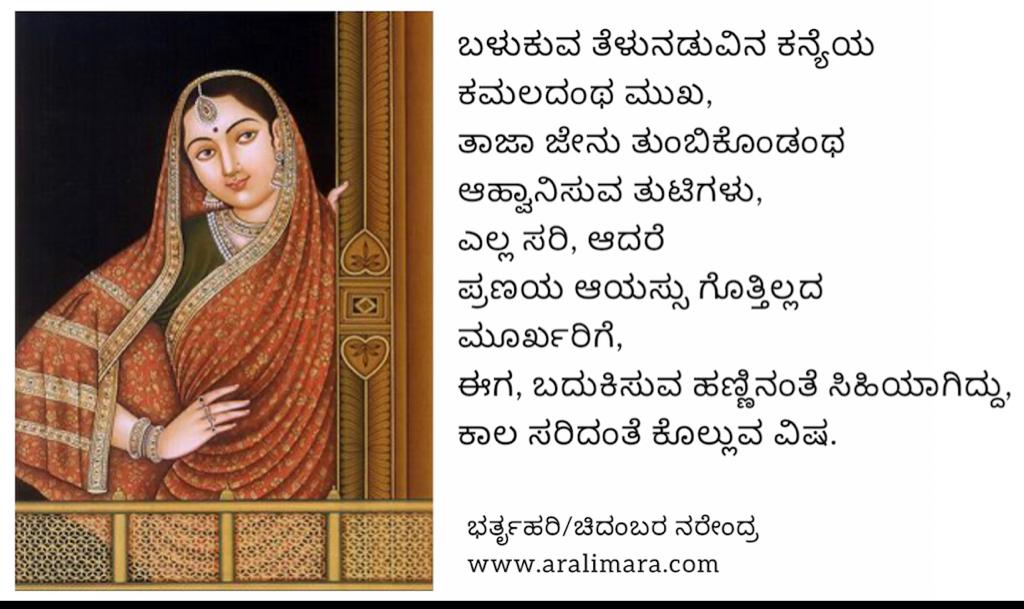 ಹೇಗೆ ತಾನೇ ಸಹಿಸಬಲ್ಲಳು! : ಶೃಂಗಾರ ಶತಕದಿಂದ… ಮಾರ್ಚ್ 21, 2021 By ಅರಳಿ ಮರ ಆಕರ: ಭರ್ತೃಹರಿಯ ಶೃಂಗಾರ ಶತಕ | ಕನ್ನಡಕ್ಕೆ : ಚಿದಂಬರ ನರೇಂದ್ರ 2 3 Share this:Tweet Click to email a link to a friend (Opens in new window) Email Click to share on Telegram (Opens in new window) Telegram Click to share on WhatsApp (Opens in new window) WhatsApp ಇನ್ನಷ್ಟು Click to print (Opens in new window) Print Click to share on Reddit (Opens in new window) Reddit Share on TumblrLike ಲೋಡ್ ಆಗುತ್ತಿದೆ... Related About ಅರಳಿ ಮರ ಆಧ್ಯಾತ್ಮ, ವ್ಯಕ್ತಿತ್ವ ವಿಕಸನ ಮತ್ತು ಜೀವನ ಶೈಲಿ