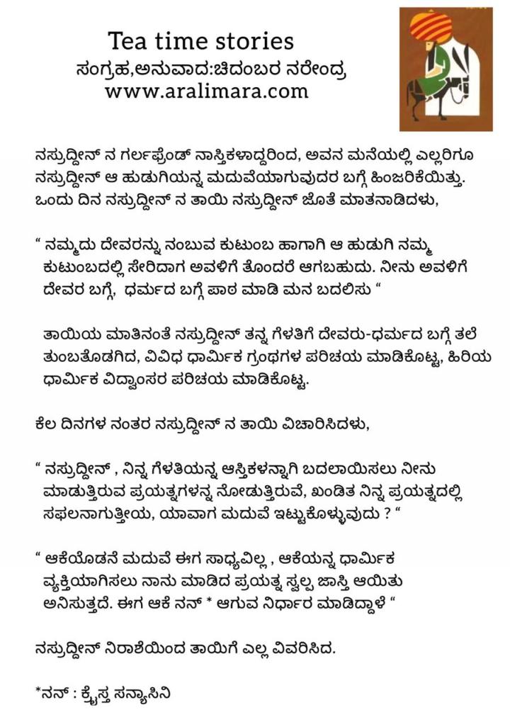 ನಸ್ರುದ್ದೀನನ ಪಾಠದ ಪರಿಣಾಮ : tea time story ಮಾರ್ಚ್ 22, 2021 By ಅರಳಿ ಮರ Share this:Tweet Email a link to a friend (Opens in new window) Email Share on Telegram (Opens in new window) Telegram Share on WhatsApp (Opens in new window) WhatsApp ಇನ್ನಷ್ಟು ಮುದ್ರಿಸಿ (Opens in new window) Print Share on Reddit (Opens in new window) Reddit Share on TumblrLike ಲೋಡ್ ಆಗುತ್ತಿದೆ... Related About ಅರಳಿ ಮರ ಆಧ್ಯಾತ್ಮ, ವ್ಯಕ್ತಿತ್ವ ವಿಕಸನ ಮತ್ತು ಜೀವನ ಶೈಲಿ