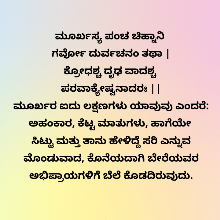 ಅರ್ಥ: ಮೂರ್ಖರ ಐದು ಲಕ್ಷಣಗಳು ಯಾವುವು ಎಂದರೆ; ಅಹಂಕಾರ, ಕೆಟ್ಟ ಮಾತುಗಳು, ಹಾಗೆಯೇ ಸಿಟ್ಟು ಮತ್ತು ತಾನು ಹೇಳಿದ್ದೆ ಸರಿ ಎನ್ನುವ ಮೊಂಡುವಾದ, ಕೊನೆಯದಾಗಿ ಬೇರೆಯವರ ಅಭಿಪ್ರಾಯಗಳಿಗೆ ಬೆಲೆ ಕೊಡದಿರುವುದು.