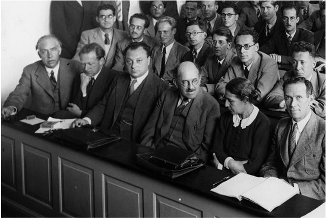 ಚಿತ್ರ: Participants at a conference in Copenhagen in 1937 ; Neil Bohr in the front row, far left, next to Warner Heisenberg and Wolfgang Pauli .