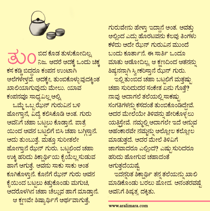 ಗುರು ಚಹಾ ಸುರಿದಿದ್ಯಾಕೆ? : ಝೆನ್ ಕಥೆ ಏಪ್ರಿಲ್ 30, 2021 By ಅರಳಿ ಮರ ಶಿಷ್ಯನ ಚಹಾ ಬಟ್ಟಲು ತುಂಬಿದ ಮೇಲೂ ಗುರು ಚಹಾ ಸುರೀತಲೇ ಹೋಗಿದ್ಯಾಕೆ? ಇಲ್ಲಿದೆ ಉತ್ತರ… Share this:Tweet Click to email a link to a friend (Opens in new window) Email Click to share on Telegram (Opens in new window) Telegram Click to share on WhatsApp (Opens in new window) WhatsApp ಇನ್ನಷ್ಟು Click to print (Opens in new window) Print Click to share on Reddit (Opens in new window) Reddit Share on TumblrLike ಲೋಡ್ ಆಗುತ್ತಿದೆ... Related About ಅರಳಿ ಮರ ಆಧ್ಯಾತ್ಮ, ವ್ಯಕ್ತಿತ್ವ ವಿಕಸನ ಮತ್ತು ಜೀವನ ಶೈಲಿ