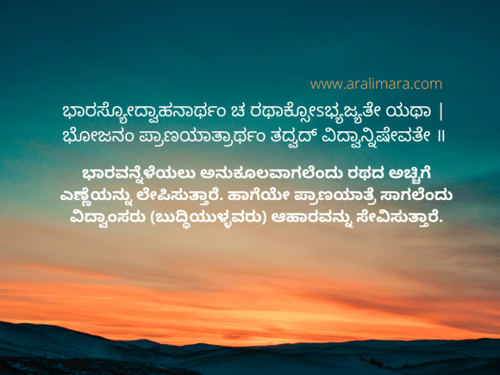 ಅರ್ಥ: ಭಾರವನ್ನೆಳೆಯಲು ಅನುಕೂಲವಾಗಲೆಂದು ರಥದ ಅಚ್ಚಿಗೆ ಎಣ್ಣೆಯನ್ನು ಲೇಪಿಸುತ್ತಾರೆ. ಹಾಗೆಯೇ ಪ್ರಾಣಯಾತ್ರೆ ಸಾಗಲೆಂದು ವಿದ್ವಾಂಸರು (ಬುದ್ಧಿಯುಳ್ಳವರು) ಆಹಾರವನ್ನು ಸೇವಿಸುತ್ತಾರೆ.
