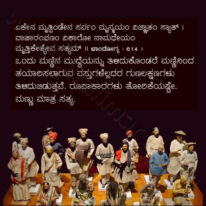 ಮಣ್ಣಿನಿಂದ ಮಾಡಿದ ಗೊಂಬೆ / ಕುಂಭಗಳ ಆಕಾರ ಏನೇ ಇದ್ದರೂ ಯಾವ ಮಣ್ಣಿನಿಂದ ಮಾಡಿರುತ್ತಾರೆಯೋ ಅದರ ಮೇಲೆ ಅವುಗಳ ಗುಣಮಟ್ಟ ನಿರ್ಧಾರವಾಗುತ್ತದೆ. ಹಾಗೆಯೇ, ಹೊರಗು ಏನೇ ಇದ್ದರೂ ಅಂತರಂಗದಲ್ಲಿ ಏನಿದೆಯೋ ಅದೇ ಮುಖ್ಯವಾಗುತ್ತದೆ. ಅಂತರಂಗವಷ್ಟೆ ಸತ್ಯ, ಬಾಹ್ಯದ ತೋರುಗಾಣಿಕೆಯಲ್ಲ….