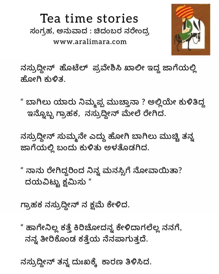 ನಸ್ರುದ್ದೀನನ ದುಃಖಕ್ಕೆ ಕಾರಣ : tea time story ಮೇ 24, 2021 By ಅರಳಿ ಮರ Share this:Tweet Click to email a link to a friend (Opens in new window) Email Click to share on Telegram (Opens in new window) Telegram Click to share on WhatsApp (Opens in new window) WhatsApp ಇನ್ನಷ್ಟು Click to print (Opens in new window) Print Click to share on Reddit (Opens in new window) Reddit Share on TumblrLike ಲೋಡ್ ಆಗುತ್ತಿದೆ... Related About ಅರಳಿ ಮರ ಆಧ್ಯಾತ್ಮ, ವ್ಯಕ್ತಿತ್ವ ವಿಕಸನ ಮತ್ತು ಜೀವನ ಶೈಲಿ
