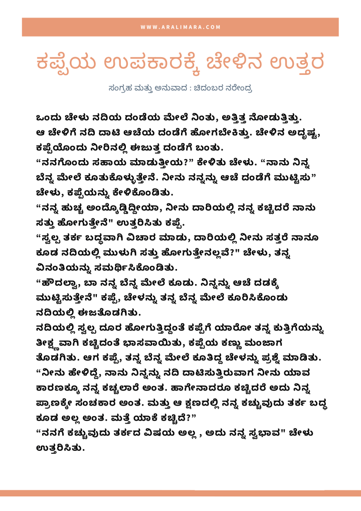ಚೇಳು ಮತ್ತು ಕಪ್ಪೆ : ಒಂದು Zen ಕಥೆ ಮೇ 24, 2021 By ಅರಳಿ ಮರ Share this:Tweet Click to email a link to a friend (Opens in new window) Email Click to share on Telegram (Opens in new window) Telegram Click to share on WhatsApp (Opens in new window) WhatsApp ಇನ್ನಷ್ಟು Click to print (Opens in new window) Print Click to share on Reddit (Opens in new window) Reddit Share on TumblrLike ಲೋಡ್ ಆಗುತ್ತಿದೆ... Related About ಅರಳಿ ಮರ ಆಧ್ಯಾತ್ಮ, ವ್ಯಕ್ತಿತ್ವ ವಿಕಸನ ಮತ್ತು ಜೀವನ ಶೈಲಿ
