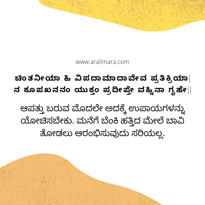 ಆಪತ್ತು ಬರುವ ಮೊದಲೇ ಅದಕ್ಕೆ ಉಪಾಯಗಳನ್ನು ಯೋಚಿಸಬೇಕು. ಮನೆಗೆ ಬೆಂಕಿ ಹತ್ತಿದ ಮೇಲೆ ಬಾವಿ ತೋಡಲು ಆರಂಭಿಸುವುದು ಸರಿಯಲ್ಲ.