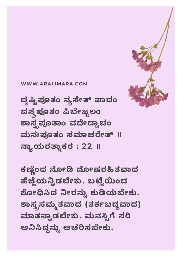 ದೃಷ್ಟಿಪೂತಂ ನ್ಯಸೇತ್ ಪಾದಂ ವಸ್ತ್ರಪೂತಂ ಪಿಬೇಜ್ಜಲಂ ಶಾಸ್ತ್ರಪೂತಾಂ ವದೇದ್ವಾಚಂ ಮನಃಪೂತಂ ಸಮಾಚರೇತ್ ॥ನ್ಯಾಯರತ್ನಾಕರ : 22 ॥ ಅರ್ಥ: ಕಣ್ಣಿಂದ ನೋಡಿ ದೋಷರಹಿತವಾದ ಹೆಜ್ಜೆಯನ್ನಿಡಬೇಕು. ಬಟ್ಟೆಯಿಂದ ಶೋಧಿಸಿದ ನೀರನ್ನು ಕುಡಿಯಬೇಕು. ಶಾಸ್ತ್ರಸಮ್ಮತವಾದ (ತರ್ಕಬದ್ಧವಾದ) ಮಾತನ್ನಾಡಬೇಕು. ಮನಸ್ಸಿಗೆ ಸರಿ ಅನಿಸಿದ್ದನ್ನು ಆಚರಿಸಬೇಕು. ತಾತ್ಪರ್ಯ: ನಾವು ಹೆಜ್ಜೆ ಇಡುವಾಗ ದಾರಿಯನ್ನು ಸರಿಯಾಗಿ ಗಮನಿಸಿ ಹೆಜ್ಜೆ ಇಡಬೇಕು. ಇಲ್ಲದಿದ್ದರೆ ಕಲ್ಲು ಮುಳ್ಳು ಚುಚ್ಚಿಯೋ, ಕೊರಕಲಿಗೆ ಬಿದ್ದೋ ಗಾಯವಾಗುವುದು ಖಚಿತ. ಹಾಗೆಯೇ ಬಟ್ಟೆಯಿಂದ ಶೋಧಿಸಿದ ಶುದ್ಧ ನೀರನ್ನು ಕುಡಿಯಬೇಕು. (ಈ ಕಾಲದಲ್ಲಿ ಫಿಲ್ಟರ್`ಗೆ ಹಾಕಿ ಶೋಧಿಸಿದ ನೀರು ಎಂದು ಇದನ್ನು ಅರ್ಥ ಮಾಡಿಕೊಳ್ಳಬೇಕು). ಇಲ್ಲವಾದರೆ ಖಾಯಿಲೆ ಖಚಿತ. ಅದೇ ರೀತಿ, ತರ್ಕಬದ್ಧವಾಗಿ, ಸುಸಂಬದ್ಧ ಉಲ್ಲೇಖಗಳೊಡನೆ ಮಾತನಾಡುವುದು ಉತ್ತಮ. ಇದು ನಾವು ಆಡುವ ಮಾತಿಗೊಂದು ಅಧಿಕೃತತೆ ತಂದುಕೊಡುತ್ತದೆ. ಕೊನೆಯದಾಗಿ, ನಮ್ಮ ಮನಸ್ಸಿಗೆ ಯಾವುದು ಸರಿ ಅನಿಸುತ್ತದೆಯೋ ಅದನ್ನು ಮಾಡಬೇಕು. ಯಾರ ಒತ್ತಡಕ್ಕಾಗಲೀ, ಇತರ ಆಮಿಷಕ್ಕಾಗಲೀ ಬಲಿಯಾಗದೆ, ನಮ್ಮ ಮನ್ಸ್ಸಾಕ್ಷೀಗೆ ತಕ್ಕಂತೆ, ಅದು ಹೇಳಿದ ದಾರಿಯಲ್ಲಿ ನಡೆಯಬೇಕು.