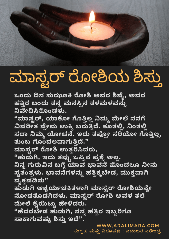 ಮಾಸ್ಟರ್ ರೋಶಿಯ ಶಿಸ್ತು : ಒಂದು ಝೆನ್ ಕಥೆ ಜೂನ್ 14, 2021 By ಅರಳಿ ಮರ Share this:Tweet Click to email a link to a friend (Opens in new window) Email Click to share on Telegram (Opens in new window) Telegram Click to share on WhatsApp (Opens in new window) WhatsApp ಇನ್ನಷ್ಟು Click to print (Opens in new window) Print Click to share on Reddit (Opens in new window) Reddit Share on TumblrLike ಲೋಡ್ ಆಗುತ್ತಿದೆ... Related About ಅರಳಿ ಮರ ಆಧ್ಯಾತ್ಮ, ವ್ಯಕ್ತಿತ್ವ ವಿಕಸನ ಮತ್ತು ಜೀವನ ಶೈಲಿ