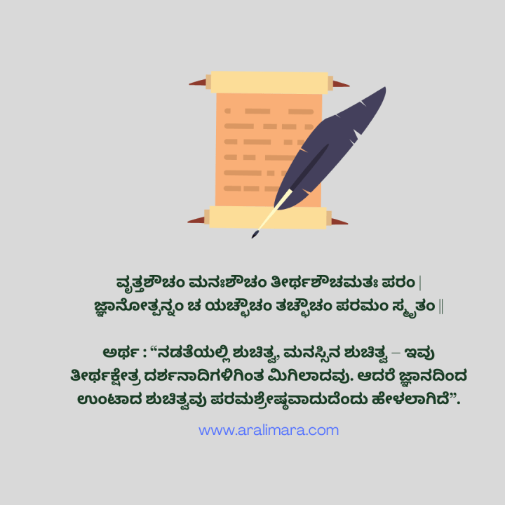 ವೃತ್ತಶೌಚಂ ಮನಃಶೌಚಂ ತೀರ್ಥಶೌಚಮತಃ ಪರಂ | ಜ್ಞಾನೋತ್ಪನ್ನಂ ಚ ಯಚ್ಛೌಚಂ ತಚ್ಛೌಚಂ ಪರಮಂ ಸ್ಮೃತಂ || ಸುಭಾಷಿತ || ಅರ್ಥ : “ನಡತೆಯಲ್ಲಿ ಶುಚಿತ್ವ, ಮನಸ್ಸಿನ ಶುಚಿತ್ವ – ಇವು ತೀರ್ಥಕ್ಷೇತ್ರ ದರ್ಶನಾದಿಗಳಿಗಿಂತ ಮಿಗಿಲಾದವು. ಆದರೆ ಜ್ಞಾನದಿಂದ ಉಂಟಾದ ಶುಚಿತ್ವವು ಪರಮಶ್ರೇಷ್ಠವಾದುದೆಂದು ಹೇಳಲಾಗಿದೆ”.