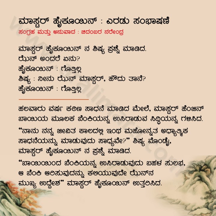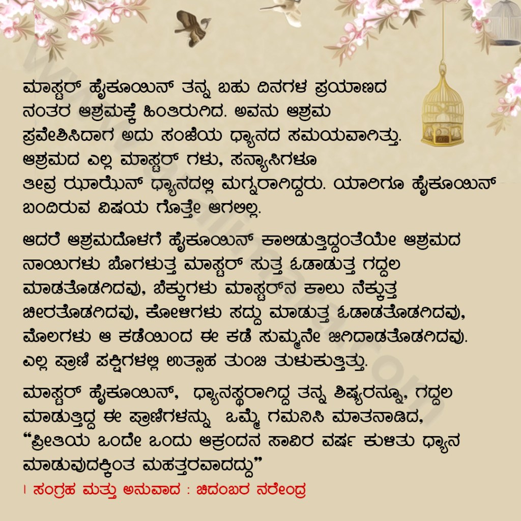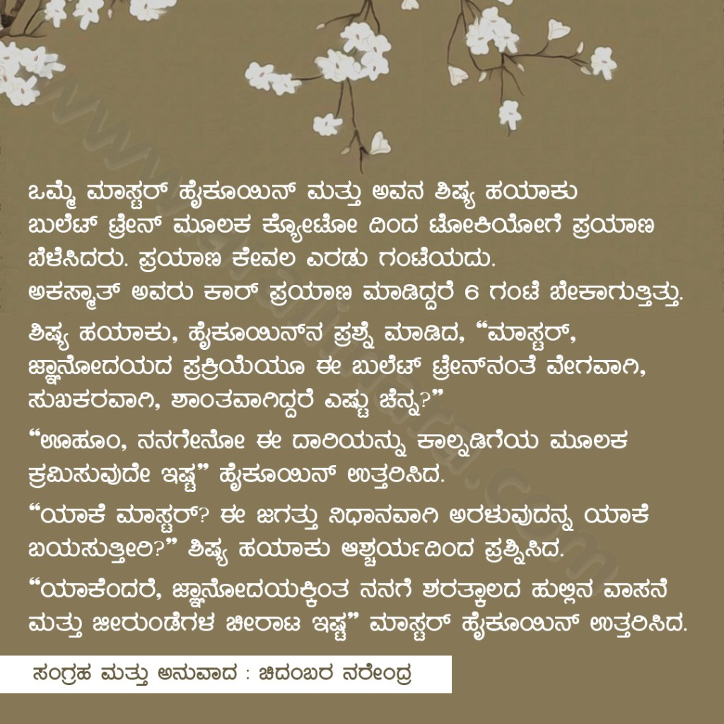 ಮಾಸ್ಟರ್ ಹೈಕೊಯಿನ್ 4 ಕಥೆಗಳು : Zen ಕಥೆಗಳು ಆಗಷ್ಟ್ 5, 2021 By ಅರಳಿ ಮರ ಇಂದಿನ ಸಂಜೆಗೆ ನಾಲ್ಕು ಝೆನ್ ಕಥೆಗಳು 2 3 4 Share this:Tweet Click to email a link to a friend (Opens in new window) Email Click to share on Telegram (Opens in new window) Telegram Click to share on WhatsApp (Opens in new window) WhatsApp ಇನ್ನಷ್ಟು Click to print (Opens in new window) Print Click to share on Reddit (Opens in new window) Reddit Share on TumblrLike ಲೋಡ್ ಆಗುತ್ತಿದೆ... Related About ಅರಳಿ ಮರ ಆಧ್ಯಾತ್ಮ, ವ್ಯಕ್ತಿತ್ವ ವಿಕಸನ ಮತ್ತು ಜೀವನ ಶೈಲಿ