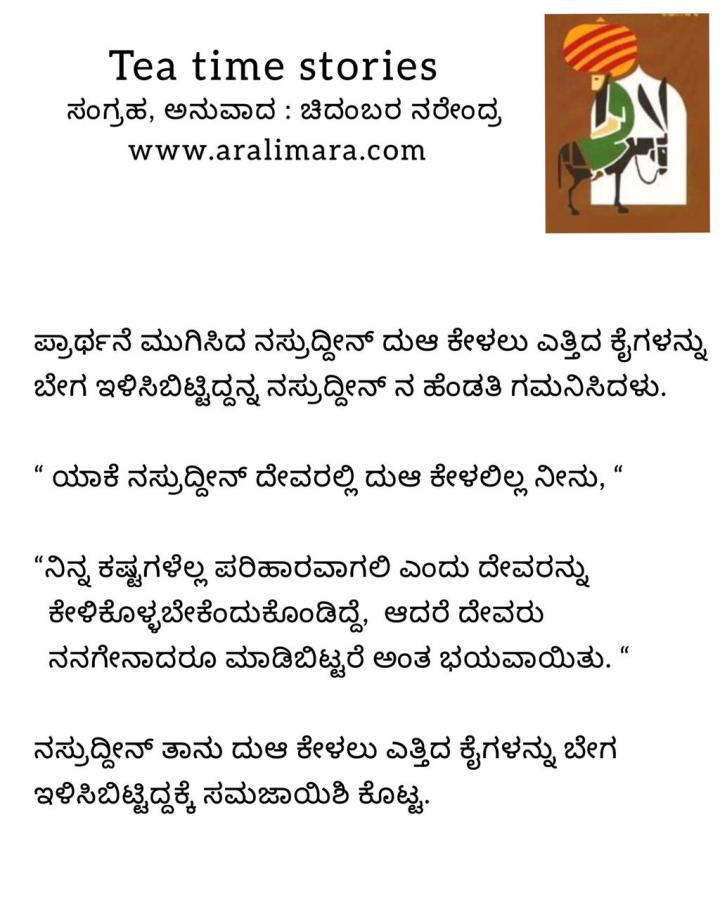 ನಸ್ರುದ್ದೀನನ ದುಆ! : tea time story ಆಗಷ್ಟ್ 26, 2021 By ಅರಳಿ ಮರ Share this:Tweet Click to email a link to a friend (Opens in new window) Email Click to share on Telegram (Opens in new window) Telegram Click to share on WhatsApp (Opens in new window) WhatsApp ಇನ್ನಷ್ಟು Click to print (Opens in new window) Print Click to share on Reddit (Opens in new window) Reddit Share on TumblrLike ಲೋಡ್ ಆಗುತ್ತಿದೆ... Related About ಅರಳಿ ಮರ ಆಧ್ಯಾತ್ಮ, ವ್ಯಕ್ತಿತ್ವ ವಿಕಸನ ಮತ್ತು ಜೀವನ ಶೈಲಿ