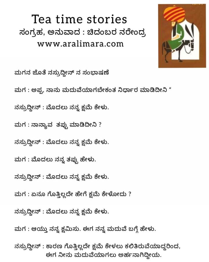 ನಸ್ರುದ್ದೀನನ ಮಗನ ಮದುವೆ ! : tea time story ಸೆಪ್ಟೆಂಬರ್ 17, 2021 By ಅರಳಿ ಮರ Share this:Tweet Click to email a link to a friend (Opens in new window) Email Click to share on Telegram (Opens in new window) Telegram Click to share on WhatsApp (Opens in new window) WhatsApp ಇನ್ನಷ್ಟು Click to print (Opens in new window) Print Click to share on Reddit (Opens in new window) Reddit Share on TumblrLike ಲೋಡ್ ಆಗುತ್ತಿದೆ... Related About ಅರಳಿ ಮರ ಆಧ್ಯಾತ್ಮ, ವ್ಯಕ್ತಿತ್ವ ವಿಕಸನ ಮತ್ತು ಜೀವನ ಶೈಲಿ
