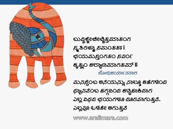 ಅರ್ಥ: ಮನಸ್ಸೆಂಬ ಆನೆಯನ್ನು ನಾಲ್ಕೂ ಕಡೆಗಳಿಂದ ಧ್ಯಾನವೆಂಬ ಹಗ್ಗದಿಂದ ಕಟ್ಟಿಹಾಕಿದಾಗ ಎಲ್ಲ ವಿಧದ ಭಯಗಳೂ ದೂರವಾಗುತ್ತವೆ. ಎಲ್ಲವೂ ಒಳಿತೇ ಆಗುತ್ತವೆ.