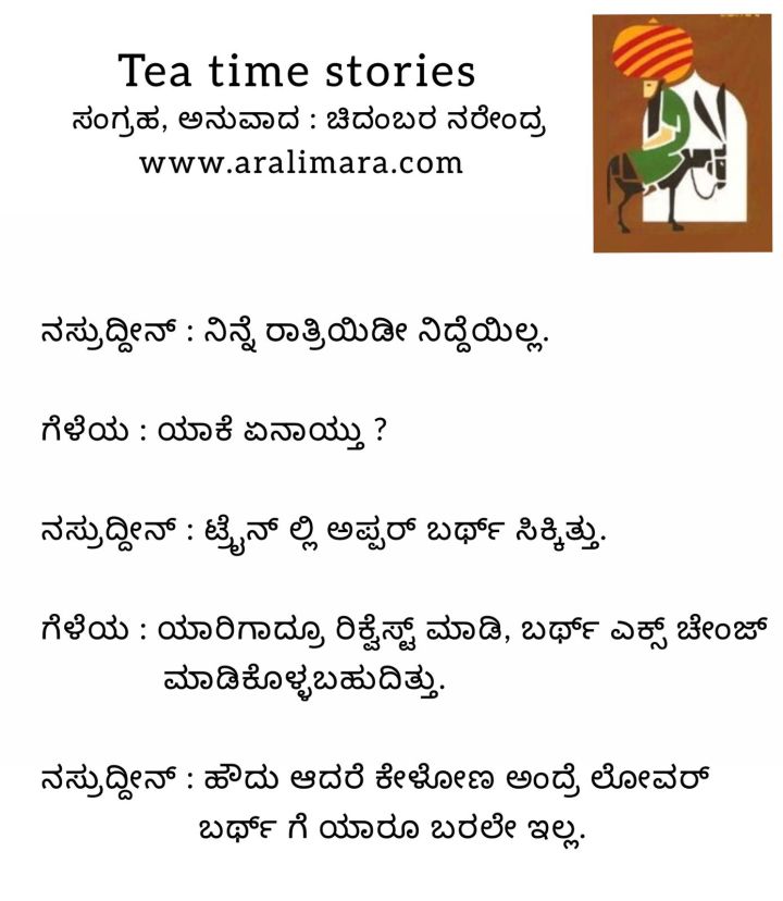 ನಸ್ರುದ್ದೀನ್ ‘ಬರ್ಥ್’ ಸಮಸ್ಯೆ : tea time story ಸೆಪ್ಟೆಂಬರ್ 23, 2021 By ಅರಳಿ ಮರ Share this:Tweet Click to email a link to a friend (Opens in new window) Email Click to share on Telegram (Opens in new window) Telegram Click to share on WhatsApp (Opens in new window) WhatsApp ಇನ್ನಷ್ಟು Click to print (Opens in new window) Print Click to share on Reddit (Opens in new window) Reddit Share on TumblrLike ಲೋಡ್ ಆಗುತ್ತಿದೆ... Related About ಅರಳಿ ಮರ ಆಧ್ಯಾತ್ಮ, ವ್ಯಕ್ತಿತ್ವ ವಿಕಸನ ಮತ್ತು ಜೀವನ ಶೈಲಿ