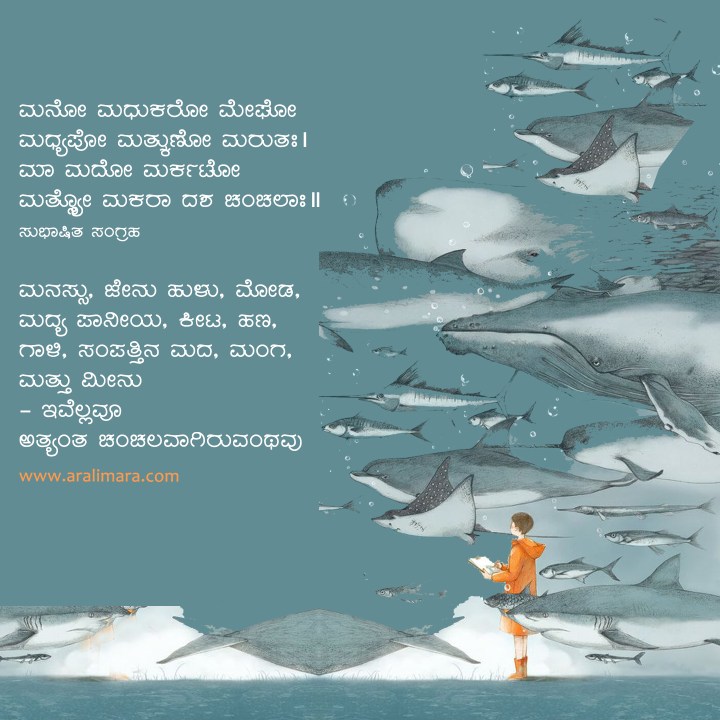 ಅರ್ಥ: ಮನಸ್ಸು, ಜೇನು ಹುಳು, ಮೋಡ, ಮದ್ಯ ಪಾನೀಯ, ಕೀಟ, ಹಣ, ಗಾಳಿ, ಸಂಪತ್ತಿನ ಮದ, ಮಂಗ, ಮತ್ತು ಮೀನು – ಇವೆಲ್ಲವೂ ಅತ್ಯಂತ ಚಂಚಲವಾಗಿರುವಂಥವು