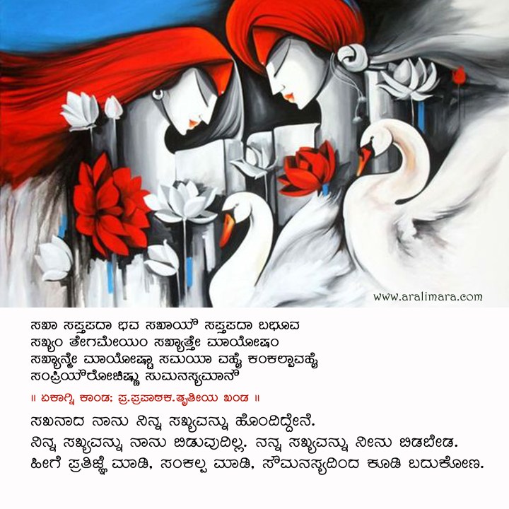 ಸಖಾ ಸಪ್ತಪದಾ ಭವ ಸಖಾಯೌ ಸಪ್ತಪದಾ ಬಭೂವ ಸಖ್ಯಂ ತೇಗಮೇಯಂ ಸಖ್ಯಾತ್ತೇ ಮಾಯೋಷಂ ಸಖ್ಯಾನ್ಮೇ ಮಾಯೋಷ್ಟಾ ಸಮಯಾ ವಹೈ ಕಂಕಲ್ಪಾವಹೈ ಸಂಪ್ರಿಯೌರೋಚಿಷ್ಣು ಸುಮನಸ್ಯಮಾನೌ || ಏಕಾಗ್ನಿ ಕಾಂಡ; ಪ್ರ.ಪ್ರಪಾಠಕ.ತೃತೀಯ ಖಂಡ ||