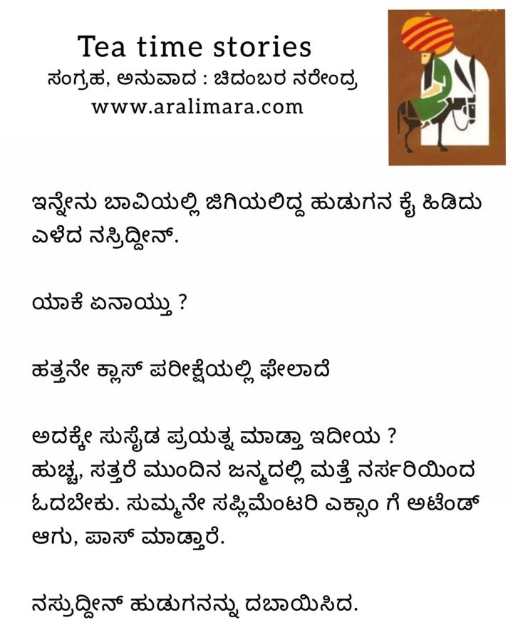 ನಸ್ರುದ್ದೀನನ ಸಲಹೆ: tea time story ಅಕ್ಟೋಬರ್ 3, 2021 By ಅರಳಿ ಮರ Share this:Tweet Click to email a link to a friend (Opens in new window) Email Click to share on Telegram (Opens in new window) Telegram Click to share on WhatsApp (Opens in new window) WhatsApp ಇನ್ನಷ್ಟು Click to print (Opens in new window) Print Click to share on Reddit (Opens in new window) Reddit Share on TumblrLike ಲೋಡ್ ಆಗುತ್ತಿದೆ... Related About ಅರಳಿ ಮರ ಆಧ್ಯಾತ್ಮ, ವ್ಯಕ್ತಿತ್ವ ವಿಕಸನ ಮತ್ತು ಜೀವನ ಶೈಲಿ